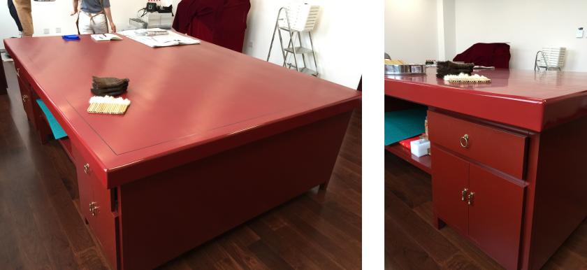 傳統(tǒng)工藝制作的裝裱案臺(tái)多為朱紅色,桌面制作黑色欄線,桌面邊角光滑處理,尺寸多為240*180*78cm或300*180*78cm,桌面厚度約12cm,臺(tái)面支架為兩組書(shū)畫(huà)柜,書(shū)畫(huà)柜為直通式,方便拿放物品。